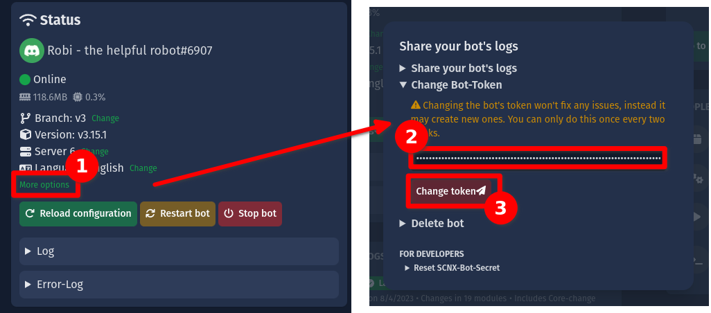 - Enter your new Bot-Token and confirm it by pressing "Change token".